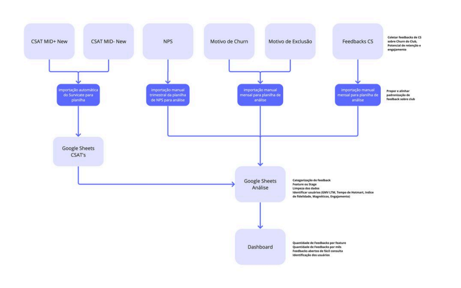 Comecei mapeando cada fonte de dados existente — pesquisas, ferramentas de NPS, sistemas de tickets — e entendendo como (ou se) os times estavam usando.