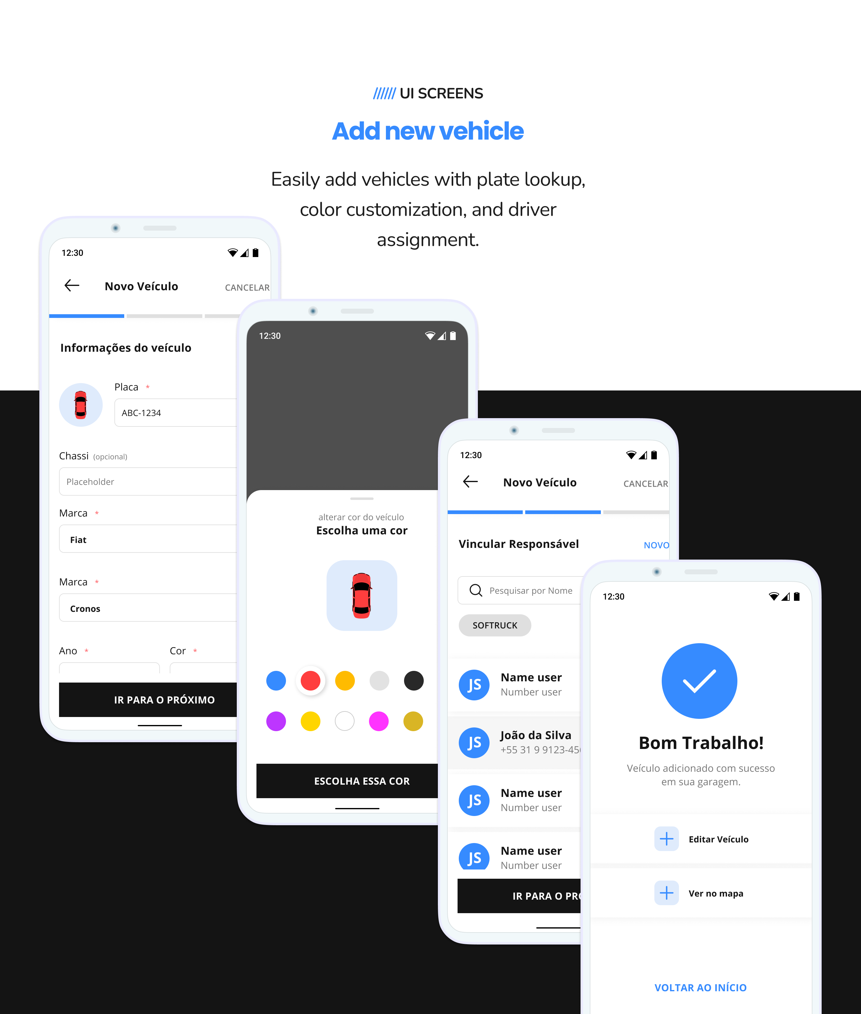 Desenhei um novo sistema visual que priorizava legibilidade em condições outdoor/veiculares — alto contraste, touch targets maiores, visualização de dados simplificada.